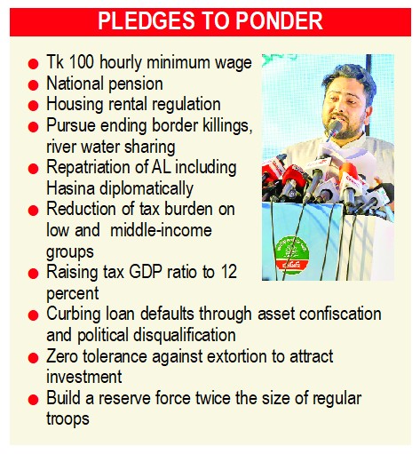 On the economy, the manifesto promises a Tk 100 hourly minimum wage, a national pension system, regulation of house rents, reduced tax pressure on low- and middle-income groups, and raising the tax-to-GDP ratio to 12 percent. It also vows to curb loan defaults through asset confiscation and political disqualification, enforce zero tolerance against extortion to attract investment, and bring inflation down to six percent.